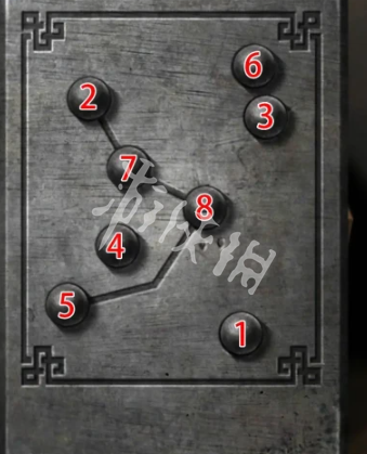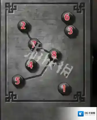 31、点击右边的小柜子放上小钢珠,查看卧室照片墙,按下图顺序点击获得钥匙。