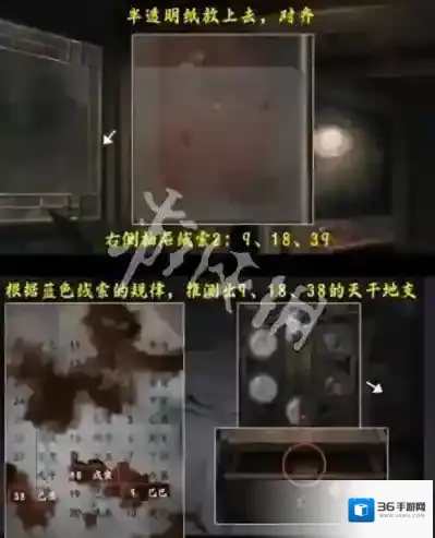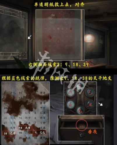 8、把半透明纸放在大门右侧的窗户对齐,然后得到日期线索-9、18、39,这也是右边抽屉的线索。