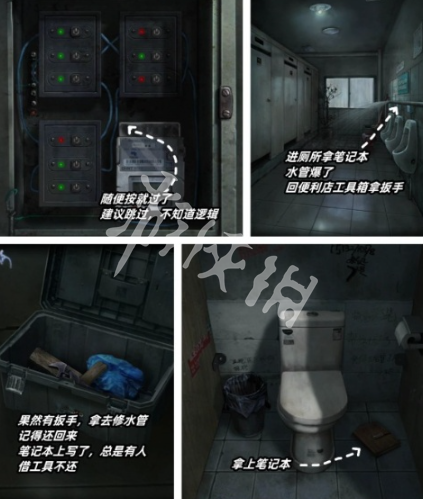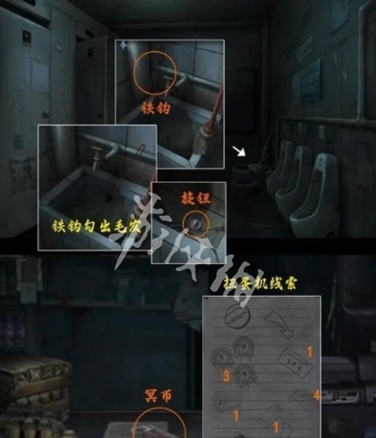 10、返回男厕,在池子上得到铁钩掏出里面的头发可以获取旋钮,前往便利店,在柜台上可以得到冥币,还能获取扭蛋机线索。