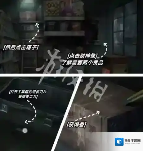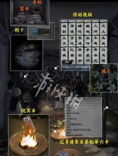26、第六步是烧纸钱,花圈上有挽联拼好拿到磁卡,然后进入左边的屋子,打开保险柜,获得冥币和手机,然后烧掉冥币。
