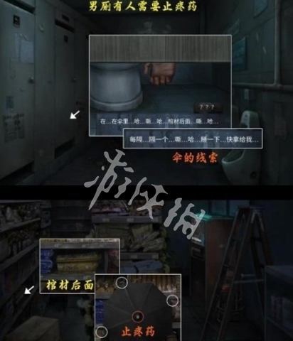 2、前往男厕,可以得到止疼药的线索,然后前往便利店,在里面棺材的后面得到黑伞,然后掰开固定帽得到止疼药。