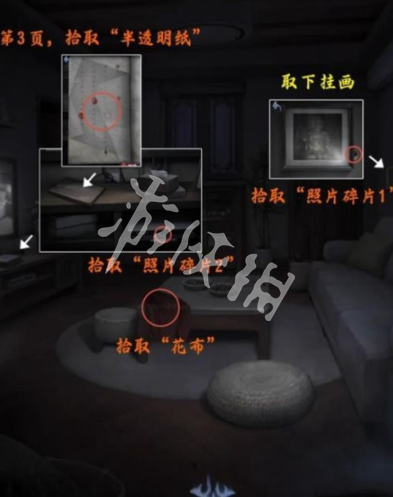 3、屋里的桌子上会有一个花布,右边挂画下有照片碎片1,电视柜里有碎片2,柜子上书籍的第三页有一个半透明纸。