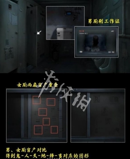 5、在男厕刚刚的坑位可以用工作证打开墙上的监控获取闺蜜的位置,并将两边窗户对比得到对应的图形。