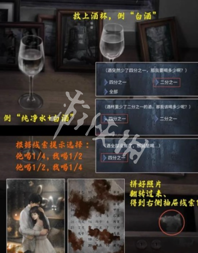 22、进入电脑房查看电脑获得照片,点击日记对话拿到纸,右边桌子获得酒,查看笔记本,之后按照下图倒酒。