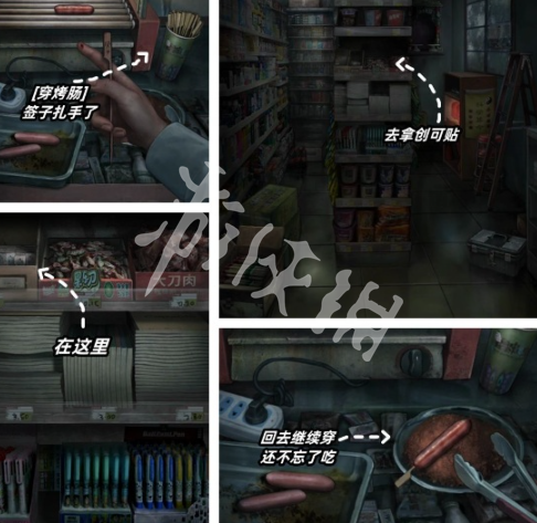 6、借助钥匙打开冰箱得到饮料,然后再拿着烤肠离开,期间倍扎到手需要拿创可贴,然后结账花费17元。