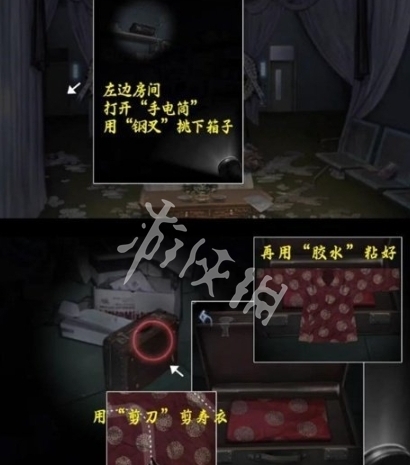 20、进入大厅左侧的房间,打开手电筒借助刚查拿下箱子,打开得到寿衣料子,然后用剪刀剪开,再用胶水粘好就能得到寿衣。