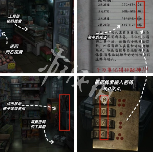 12、结合便利店监控的视频,再结合物品的形状,就能得到工具箱密码是0748,打开可以获得线缆剪。