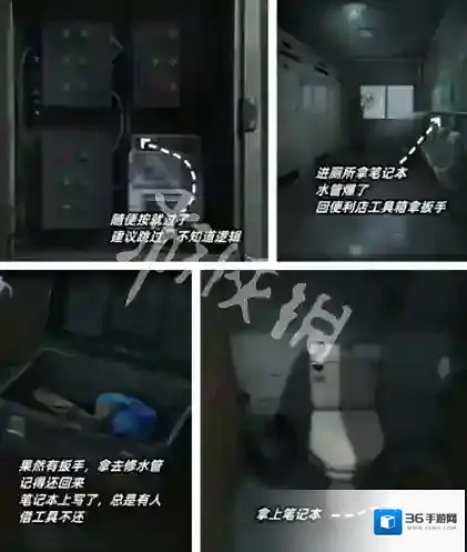 7、出门的时候发现乘客不见了,需要去厕所找,然后可以在里面找到笔记本,得知电箱密码的线索。