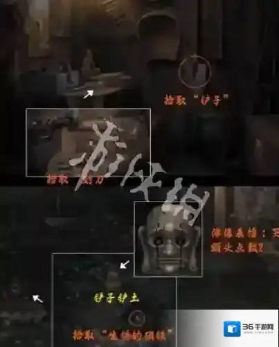 12、根据窗外佛像地板的颜色顺序,打开木屋墙上的机关,然后进屋用铲子和刻刀扒开外面的泥土,得到生锈的磁铁。