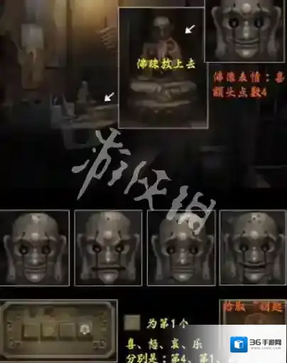 17、将佛珠放在木屋里面佛像的脖子上,得到喜、4,将四个表情和点数即可就能破解木盒机关拿到钥匙。