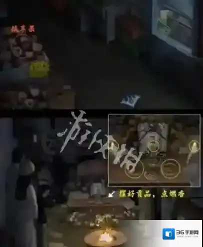 4、需要拜拜右侧的财神,并且在窗户边可以获得一个笔记本,里面有线索,再去柜台上拿着糖和水果。
