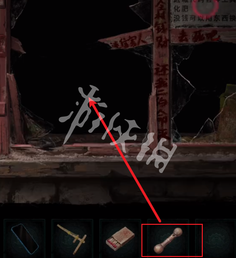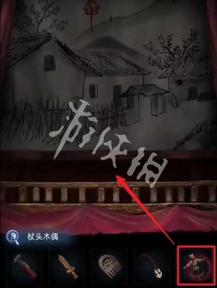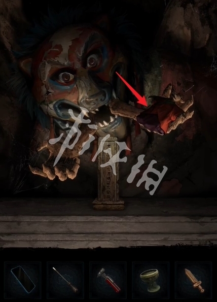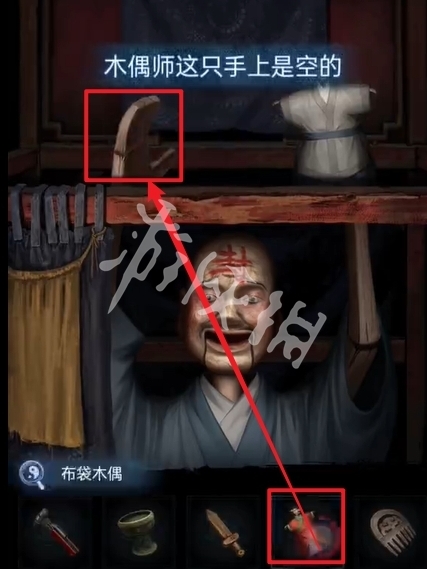 38、在图中的场景点击方框处,并将布袋木偶插在尖刀上。