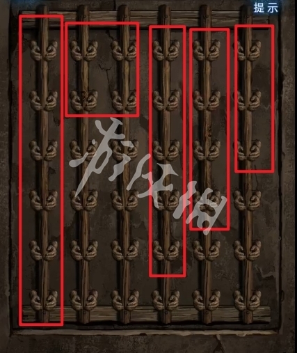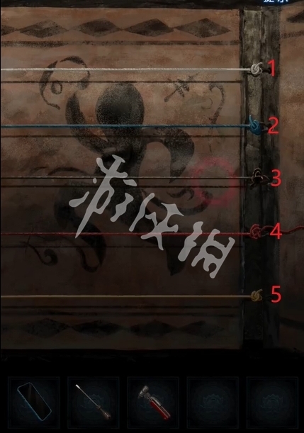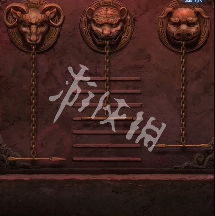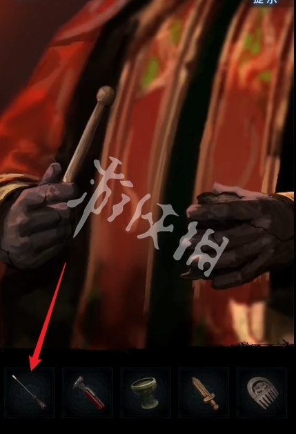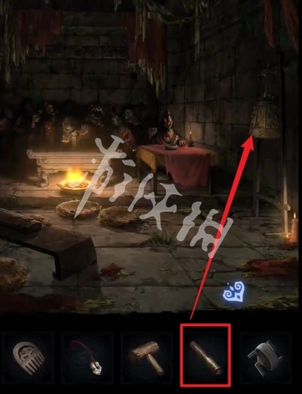 48、来到图中场景,使用小木锤和小铜棒敲击方框处的物品,顺序为小铜棒两下、小木锤一下、小铜棒一下、小木锤两下、小铜棒一下。