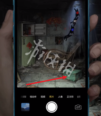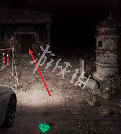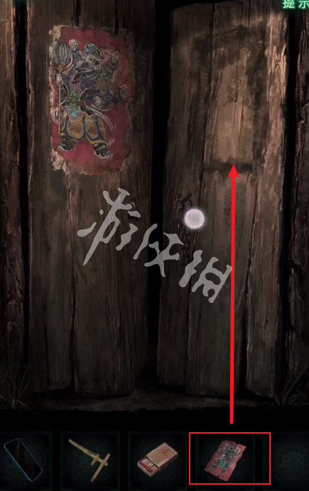 5、切换场景来这,点击右侧的门,接着将门神画像拖拽上去。