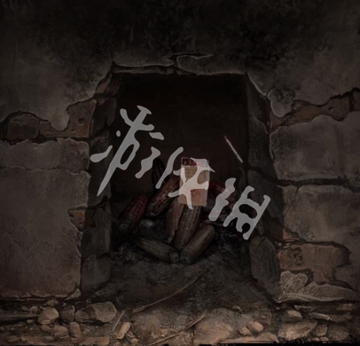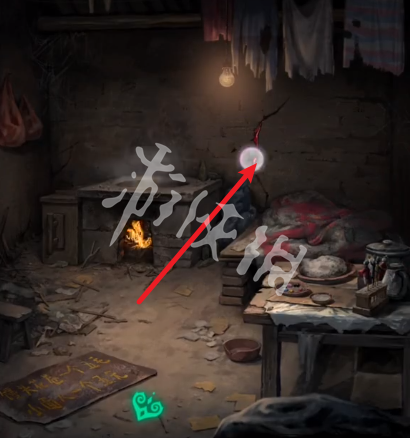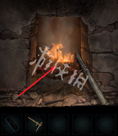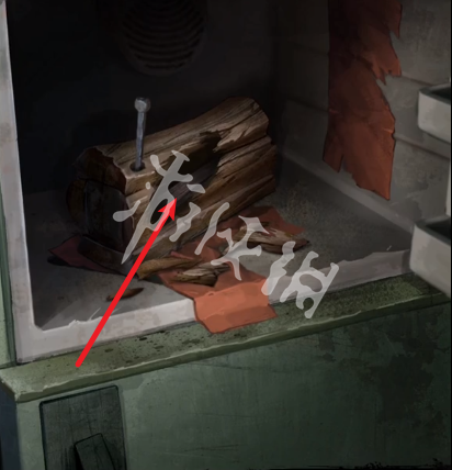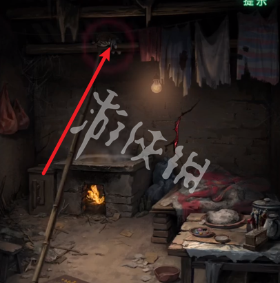 8、点击灶台,用拖动晾衣杆去火堆里翻找,拾取石片、棺材钉。