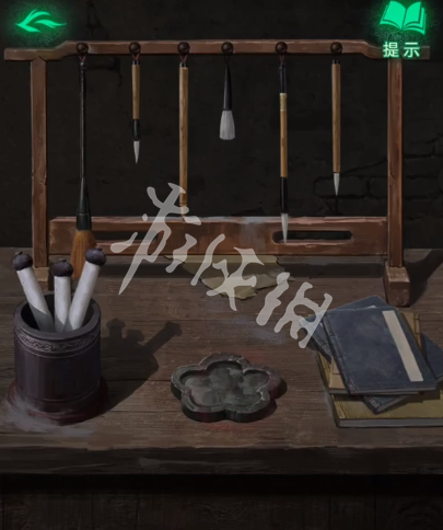 18、点击桌子,将桌上的物品按照下图位置重新摆放,毛笔直接移动位置,笔筒、砚台和书籍点击即可切换。