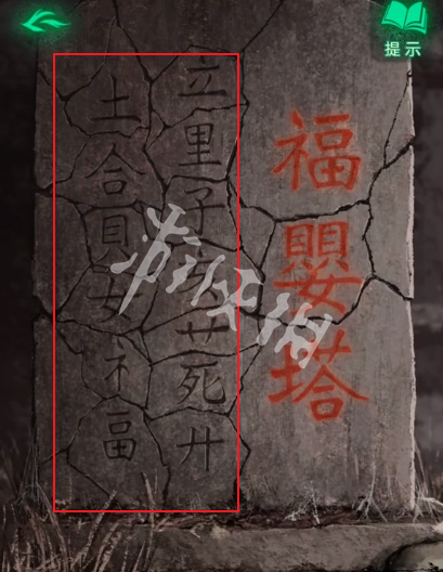 10、点击村口的石碑,将石片拖到空隙处,接着根据右边的三个字的笔画,依次点击左边的石块。