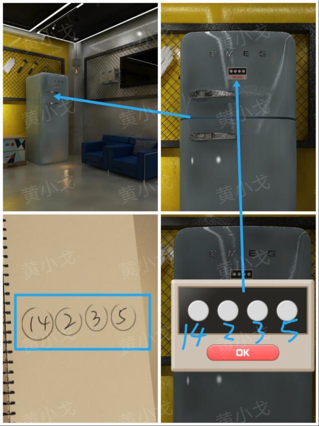 20.点击冰箱上的密码锁,根据[茶室]场景笔记本上的线索,按顺序按下按钮
