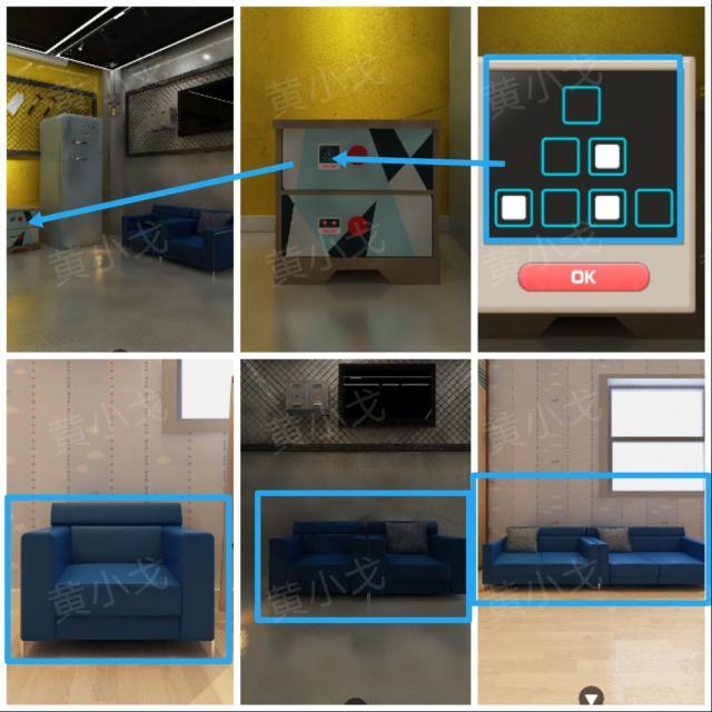 18.点击柜子上层抽屉上的密码锁,根据该场景、[老鼠洞]场景和[书架]场景沙发线索,调整密码锁