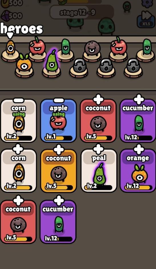 1、不同的水果蔬菜英雄等你去召唤来战斗,丰富的英雄角色可以自由选择来上阵战斗。