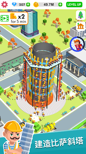 游戏中你的工人们会自动的建造大楼,并不断的为你带来收入,通过不断的点击屏幕能够加快工人的工作效率。除此之外,花费金币也能够去升级公司,例如加入更多的工人,提高工人速度等等,这样就能更加有效率的去完成建筑,让城市中出现更多你建造的标志性建筑,成为真正的建筑大亨!