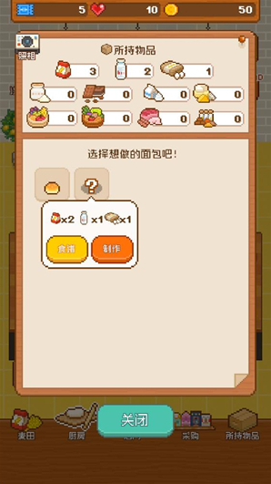 2、获得小麦粉后可以点击厨房来制作面包,每个面包都有不同的食谱,需要对应的材料才可以进行制作。