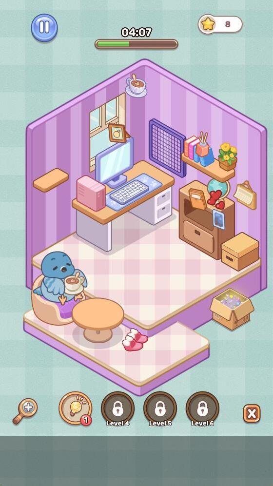 游戏里的玩法比较简单,只用放置各种各样的家具就可以通关。游戏中没有特殊的要求,只要在时间结束前放好所有家具就能完成任务,每个场景里的物品都是不同的,仔细观察来寻找不同的位置,将所有家具全部摆放整齐来体验最有趣的闯关过程。