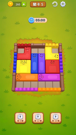 游戏里的玩法比较简单,点击关卡里的方块将其移动到对应颜色的出口就可以通关。游戏里每关都会为玩家准备不同形状和颜色的方块,同时方块的出口也不止一个,每种颜色都至少有一个出口可以使用,在有限的时间内移动这些方块来完成挑战,解决不同的问题来体验新的乐趣吧。