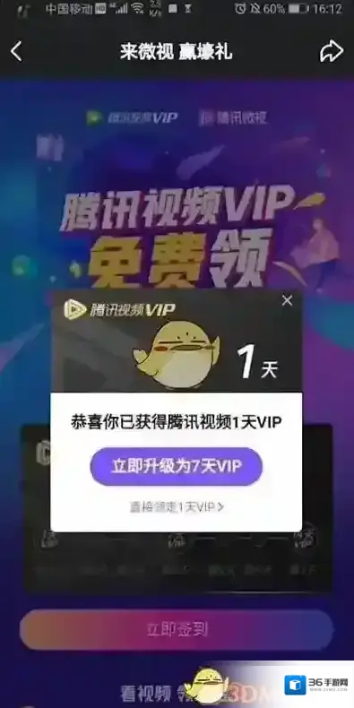 4、点击立即签到。系统便提示“恭喜你获得腾讯视频1天VIP”。