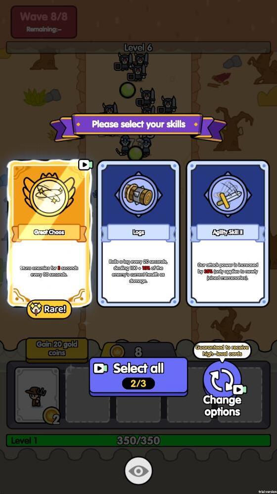 3、召唤不同的小兵需要的金币数量是不一样的,当击败敌人后会获得经验,提升等级后可以选择一个技能来强化小兵。