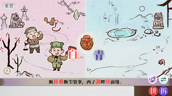 游戏中你将作为执笔人穿梭于不同的传说故事来重组文字完成诗词,通过操控汉字和场景里的物品互动来获得各种汉字,拆解这些汉字获得不同的文字,将文字两两组合来获得诗词中需要的汉字,不断拆解与组合来修复关卡里的诗词。