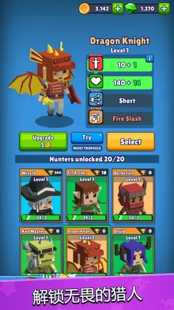 4、进入角色选择界面,查看“Dragon Knight”等猎人属性,升级技能并选择心仪角色出战。