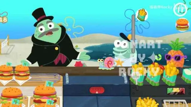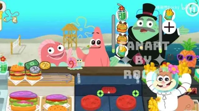 3、整体的画面采用了经典动画海绵宝宝打造而成,游玩的过程中还拥有更多的经典角色出现陪伴玩家共同经营餐厅。