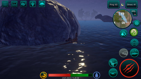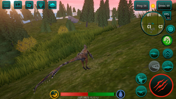 4、进入游戏后左边控制恐龙的移动,右边分别是奔跑、跳跃、攻击按键、屏幕下方中间的是你的血量和体力。两侧的是饥饿值和饥渴值,找到食物后点击带有爪子的按钮就可以进食。