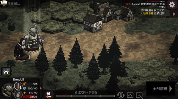 4、在前进过程中遇到敌人会触发战斗,中间的四个图标是角色的技能,每个技能都有不同的范围,当消灭敌人后就可以结束战斗。