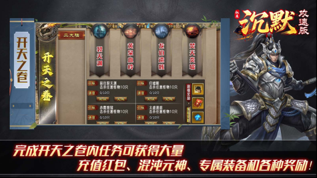2、进入二大陆后即可前往完成“开天之卷”,达成开天之卷内的条件可获得大量剧情红包、专属装备、混沌元神。