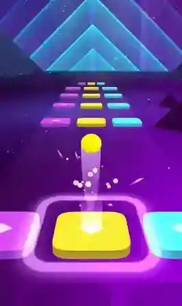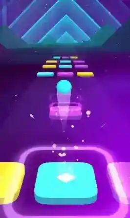 1、进入关卡,小球随音乐节奏前行,点击屏幕让其跳跃到对应颜色瓷砖(黄、紫、蓝等)。
