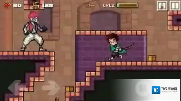2、左上角显示红心数量为20,货币数量为128,等级标识为“LVL2”,画面中有两个角色,一名持剑的角色准备攻击上方平台的敌人。