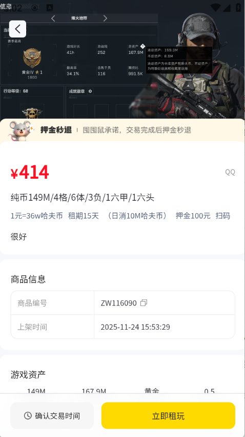 4、选择自己喜欢的账号进入详情页,点击“立即租玩”即可。